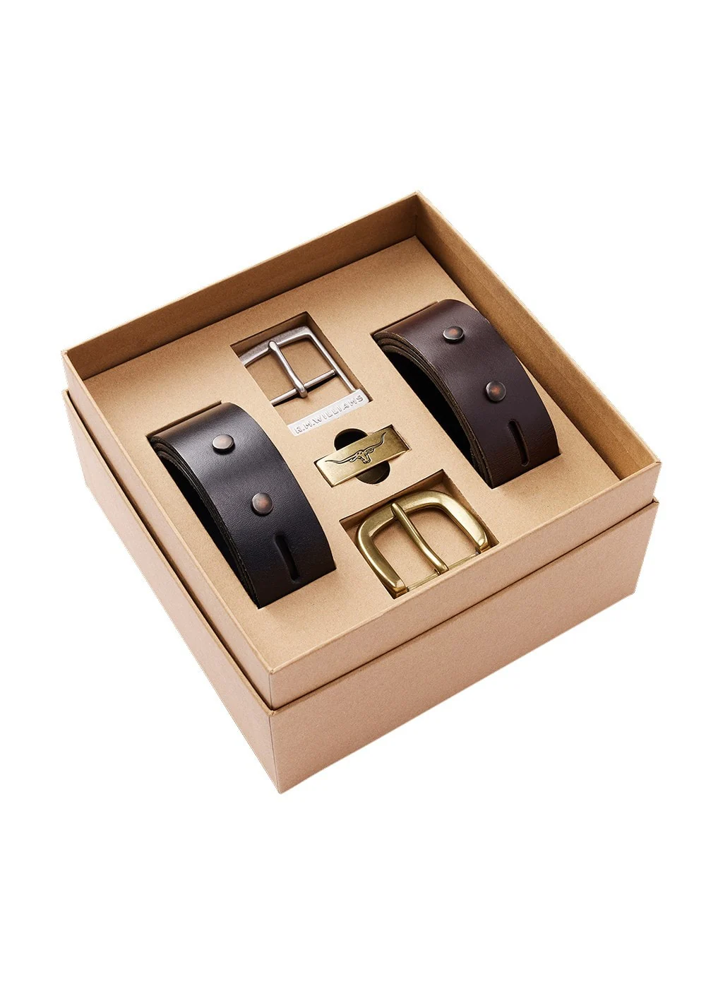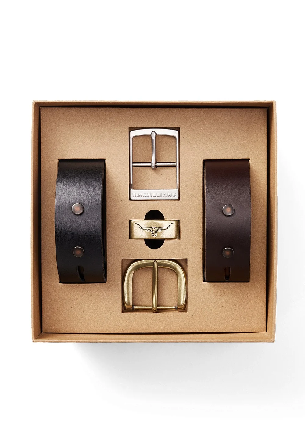 Key Features Double butt solid hide leather 1 1/2″ width Interchangeable leather straps and hardware Antique brass drover buckle and longhorn metal keeper Antique nickel metal buckle Packaged in a gift box Made in Australia Colour OptionsMid Brown CodeBGF5NCH01