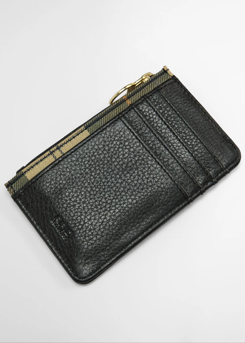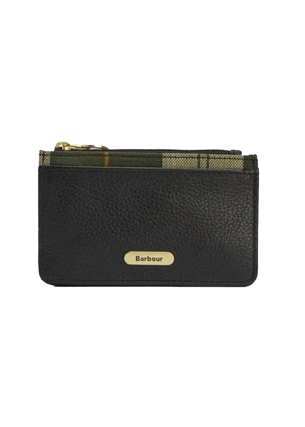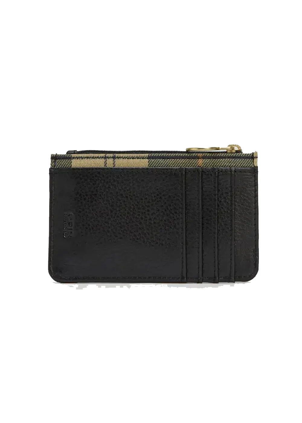 Key Features Outer : 100% Leather (Bovine) Natural Leather Barbour classic tartan trim Zipped coin pocket Trim: 100% Cotton Matt gold effect metal branded plate to outer front. Height: 8cm, Width: 13cm RFID protected Product CareDo not washWipe clean only CodeLLG0035BK11