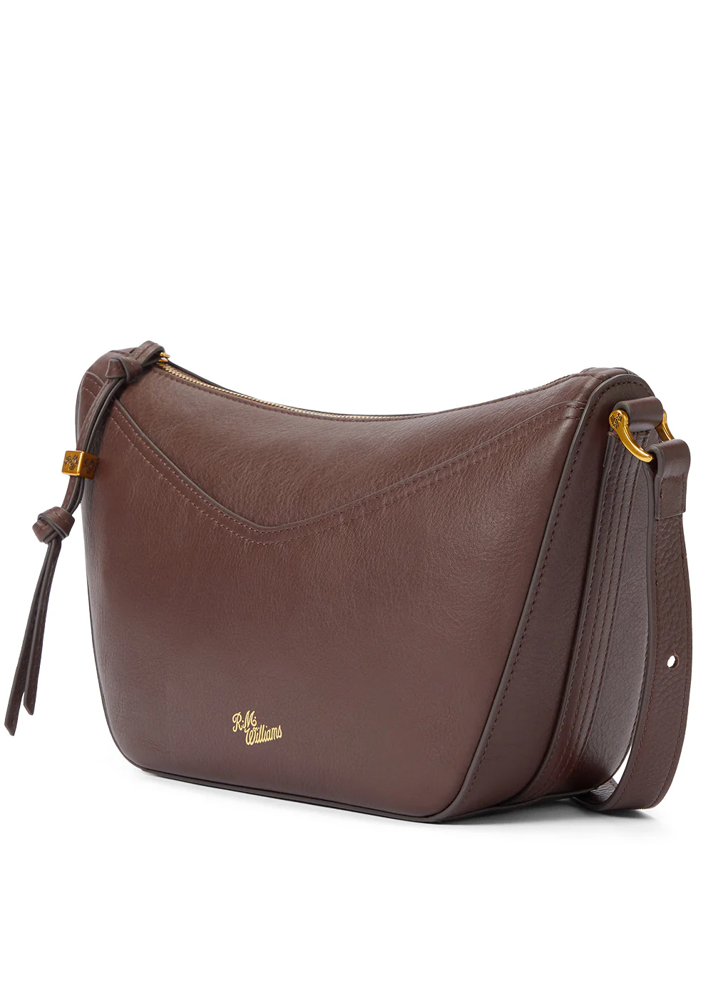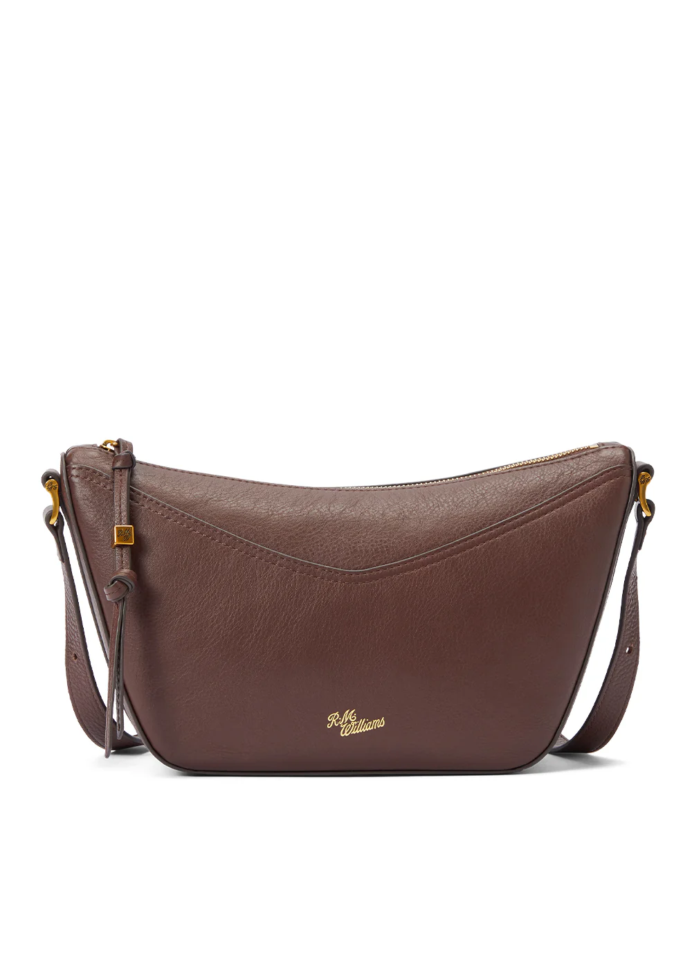 Key Features Tumbled full grain leather Kid Suede Lining Two tone cotton blend herringbone lining Adjustable cross-body strap with mushroom studs Zip closure with R.M Williams charm Internal slip pocket Script foil logo L20cm x H17cm x W9cm CodeCQS0ETL01