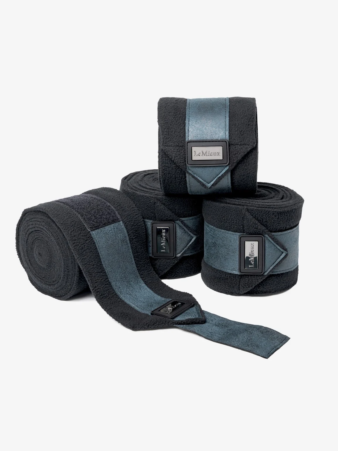 Ces magnifiques bandages de polo en polaire ont un détail d’extrémité effet daim antique qui donne un aspect subtilement marbré, et sont finis avec un motif en relief LeMieux en bronze.