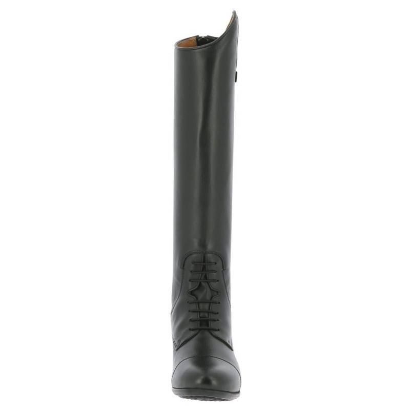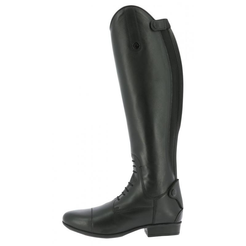 Fermeture arrière à glissière YKK montée sur support élastique, sécurisée par un bouton pression sur rabat cuir en bas et sur montant élastique en haut de tige. Doublure toute hauteur en cuir de porc.