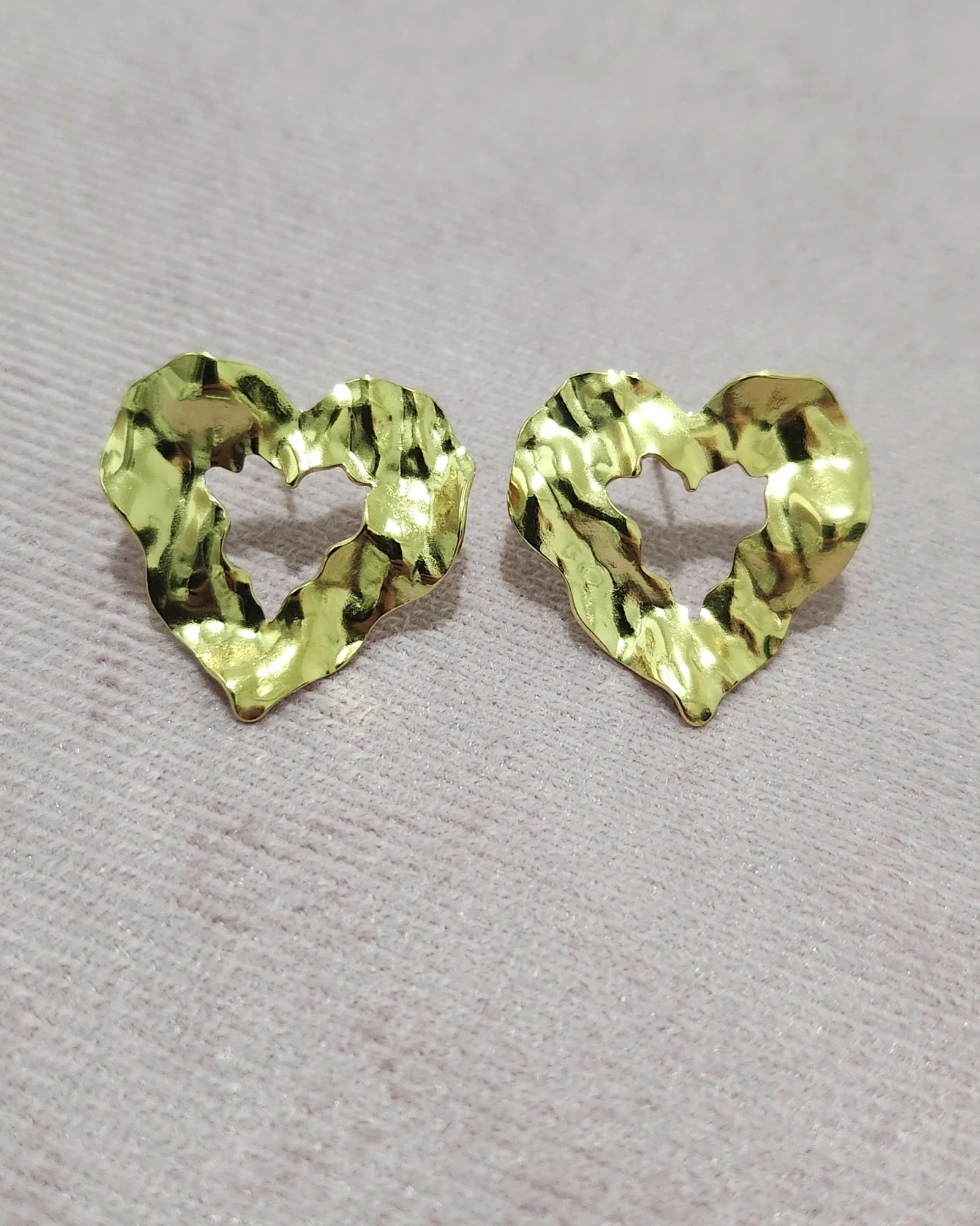 Bijoux en acier inoxydable, résiste a l’eau de mer , piscine ect . Boucle d’oreille doré en forme de coeur martelé .