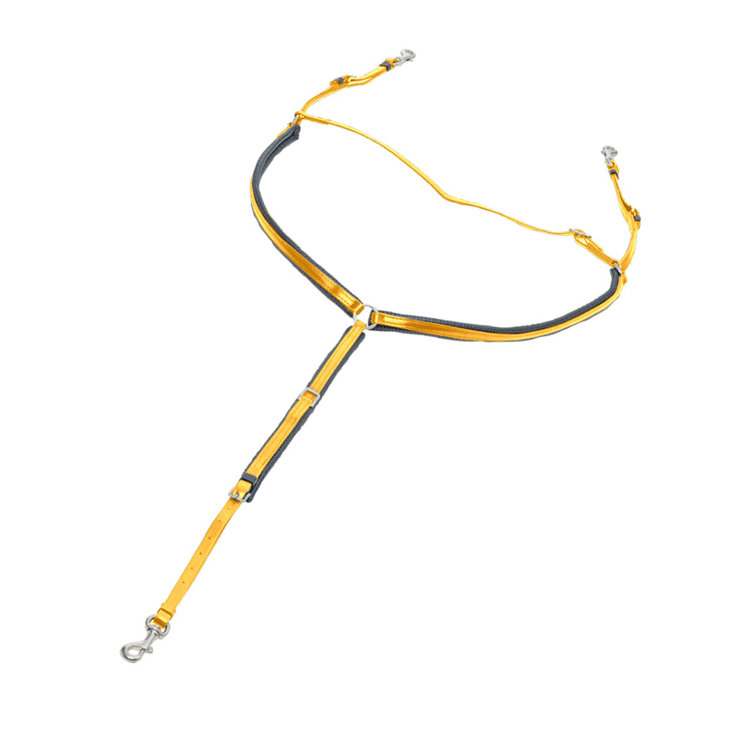 Bricole américaine en « Y ». se fixe par mousqueton des deux cotés à la sellette et à la sangle. Quatre réglages possibles: les deux cotés, sous le poitrail du cheval, au dessus de l’encolure.