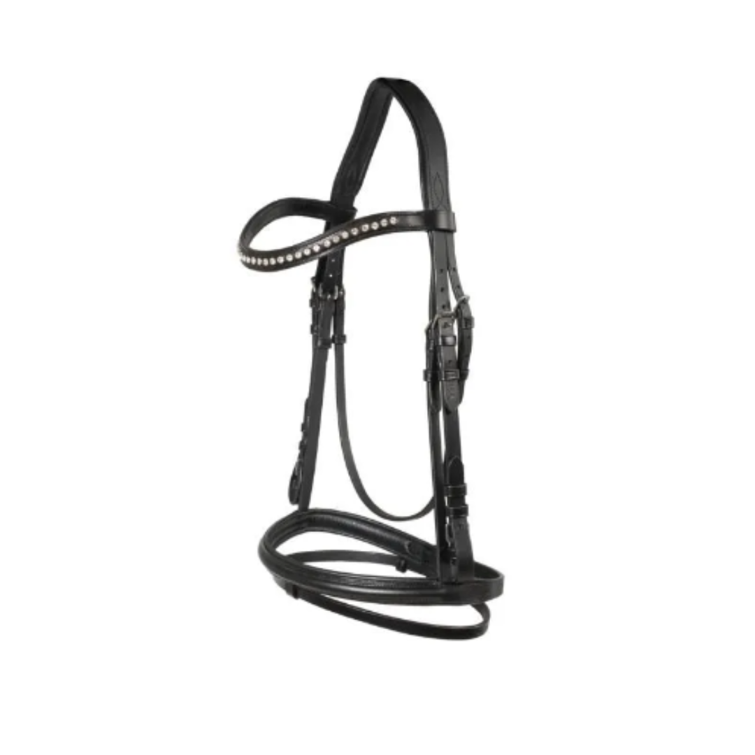 Bridon filet classique Têtière de forme ergonomique En cuir de grande qualité extrêmement souple Frontal bombé avec grands cristaux blancs Boucles et crochets en acier Muserolle combinée à lanière amovible Rênes non incluses