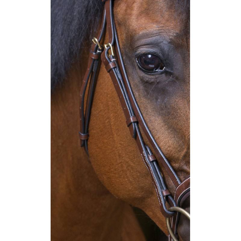 Bridon en cuir de buffle, têtière anatomique large et muserolle combinée doublées cuir vachette souple et matelassé.