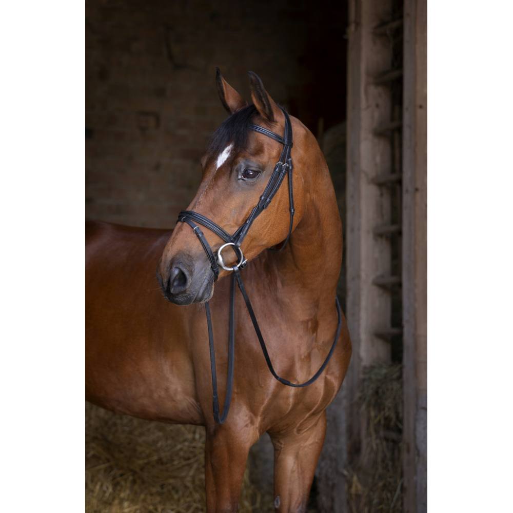 Bridon en cuir aniline. Têtière, frontal et muserolle doublés en clarino microfibre. Insert brillant en P.V.C. sur le frontal et la muserolle. Rênes caoutchouc, intérieur de la main de rênes en nylon de 2 millimètres d’épaisseur. Bouclerie inox.
