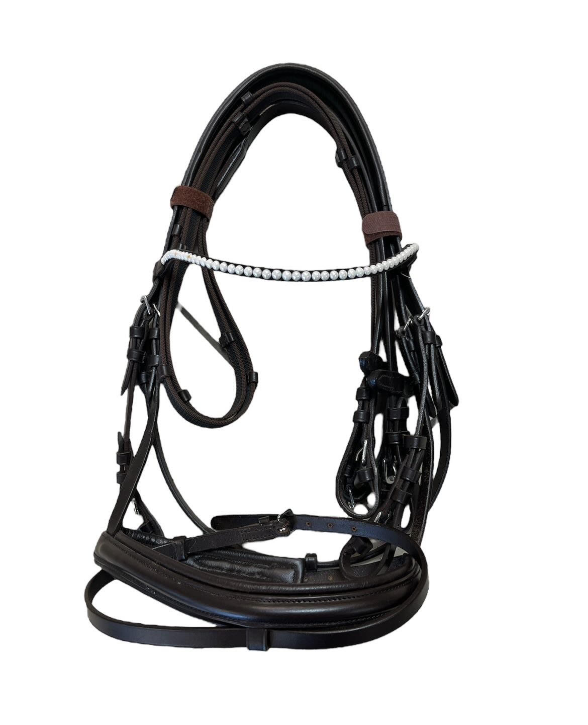 Un magnifique frontal a été ajouté à ce filet dont le prix est très abordable. En faisant le choix de commander ce bridon de cuir de couleur classique, doté d’un frontal orné de perles, vous resterez dans votre budget.