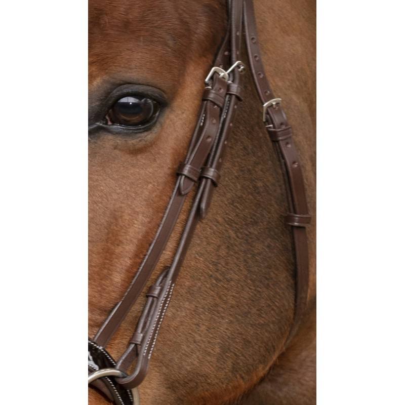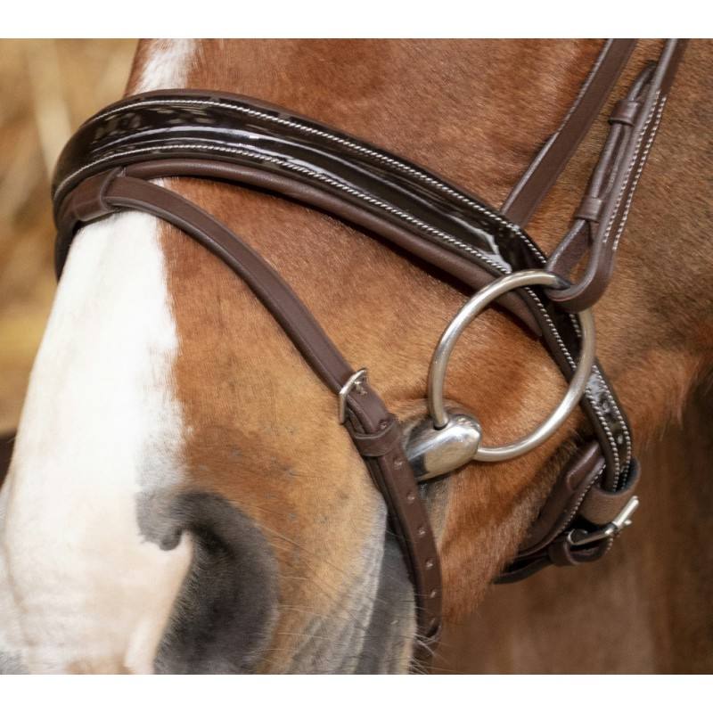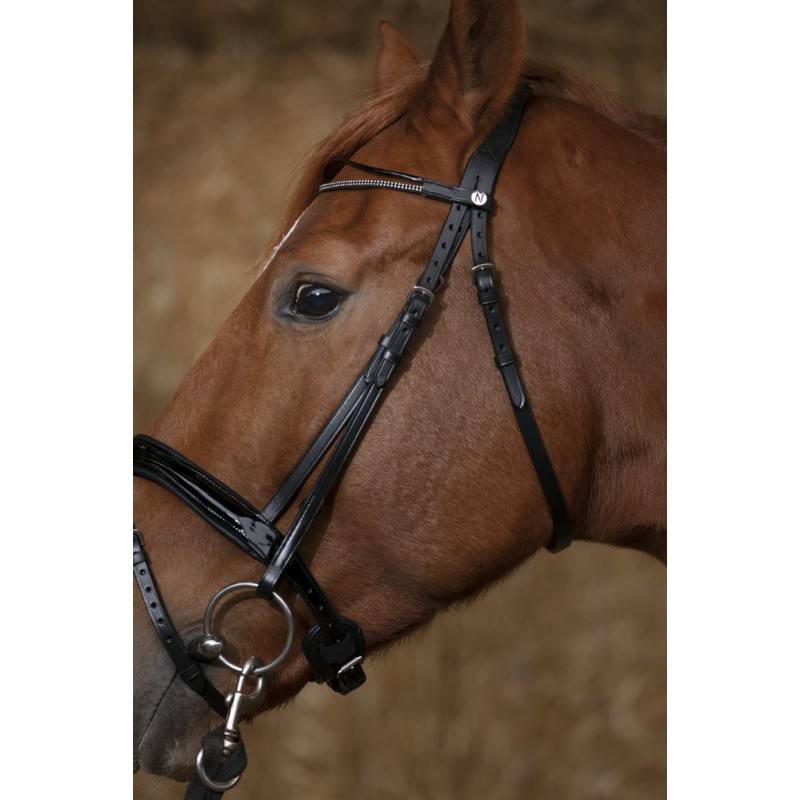 Bridon en cuir de buffle avec têtière large et muserolle vernis combinée, doublées cuir vachette.