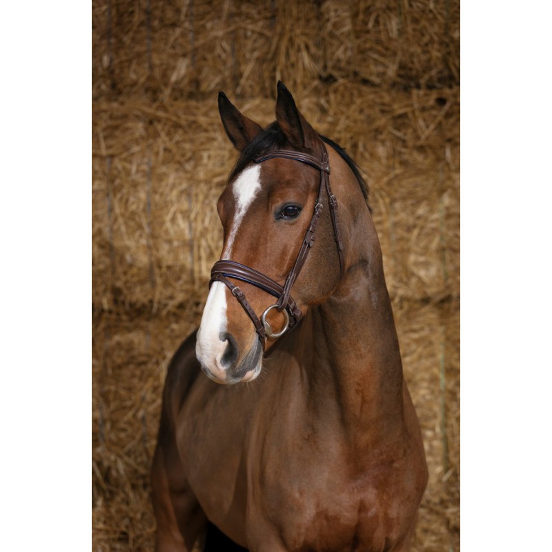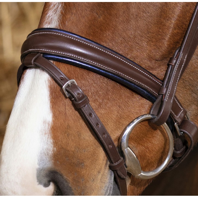 Bridon avec têtière anatomique, muserolle suédoise combinée et frontal V, doublées cuir vachette.
