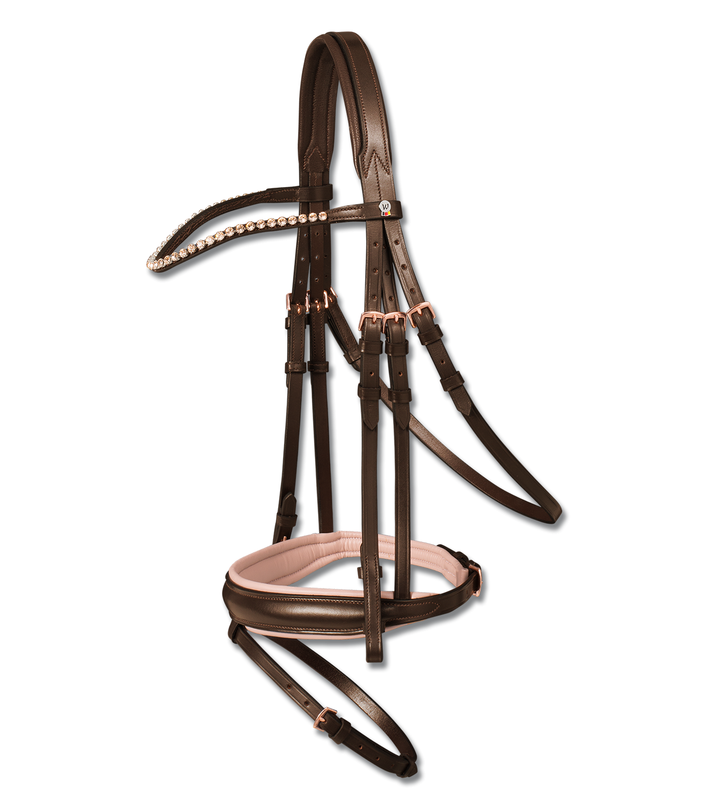 – Muserolle combinée – Têtière droite avec liberté d »oreille – Frontal en forme de vague avec Strass rose