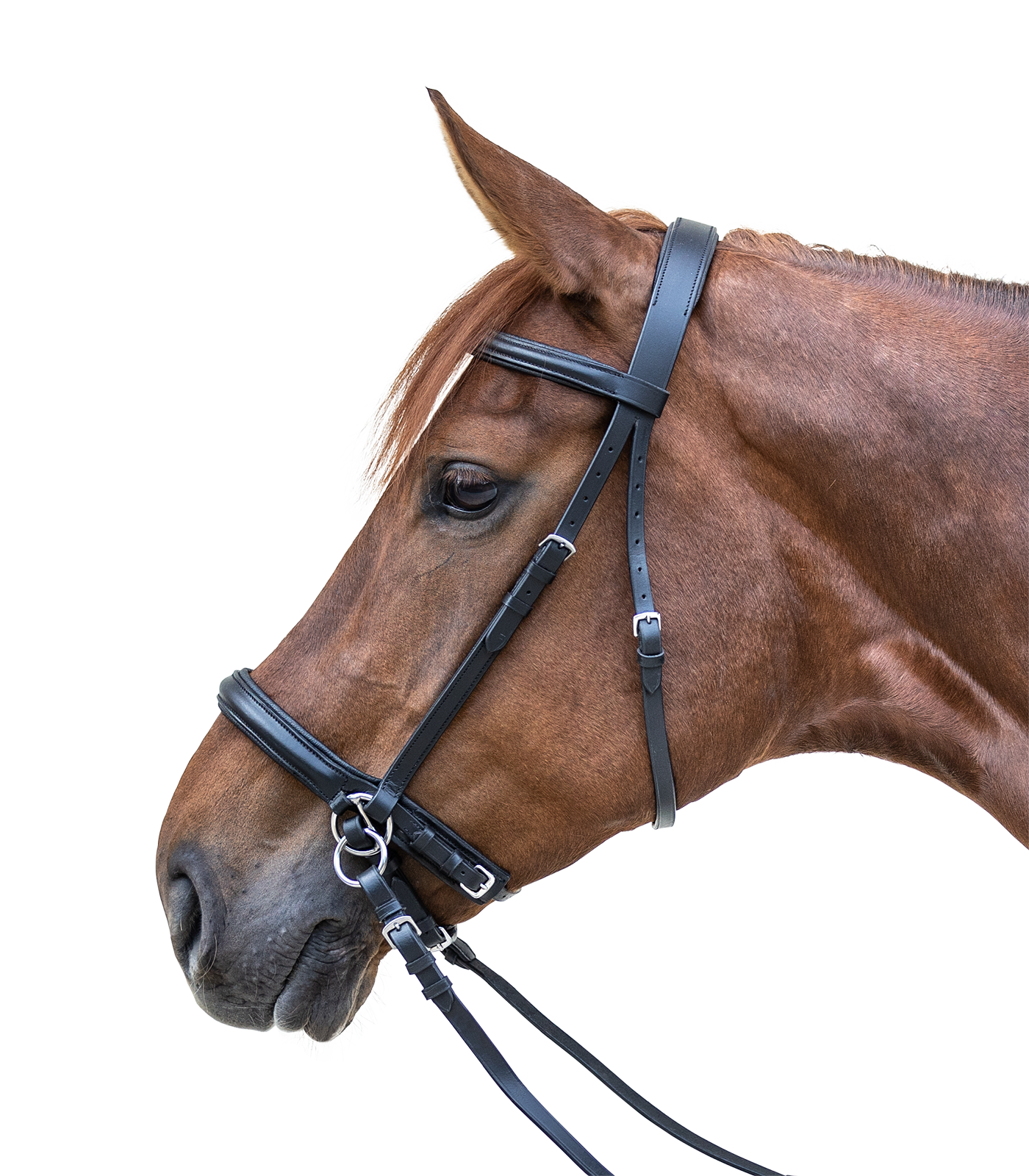 Bridon sans mors avec effet Scawbrig. Matelassure douce à la muserolle et têtière. Une alternative bienvenue pour les chevaux bien dressés. Livré avec rêne. Petits prix et à grande qualité assurée! Qualité de cuir robuste – Excellente finition.