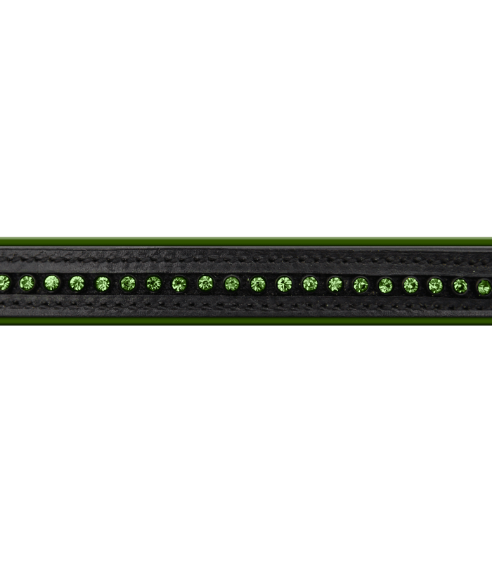 – Muserolle combinée – Têtière droite – Frontal droit avec chaînette en strass de couleur – Dessus de muserolle et frontal doublés moelleusement – Bouclerie nickelée – Brun avec bouclerie couleur laiton