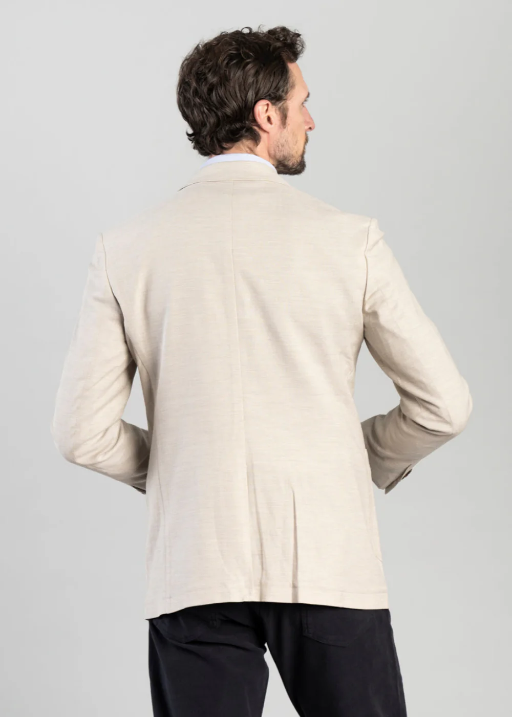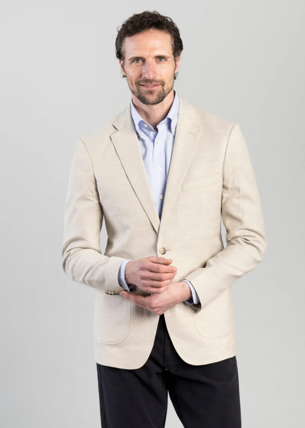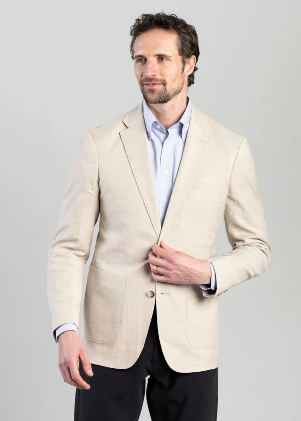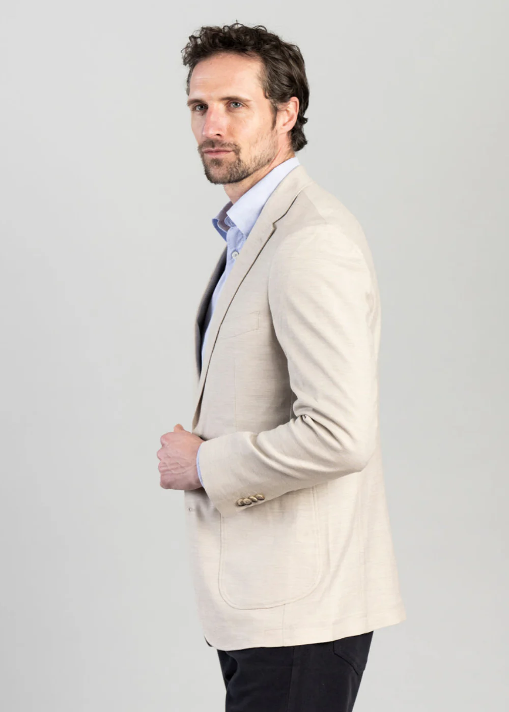 - Classic notch lapel, front patch pockets