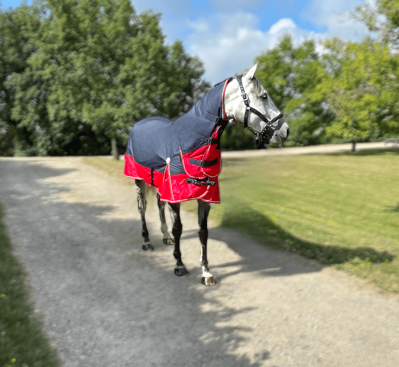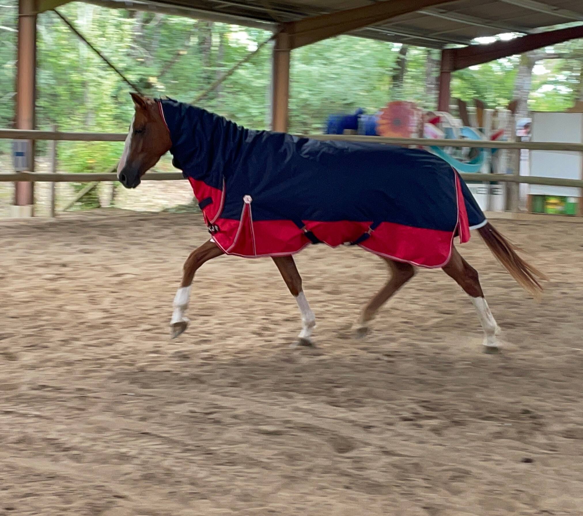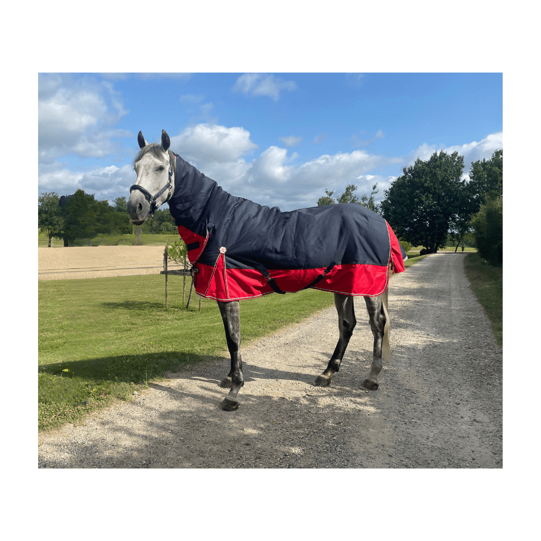 Couverture d’extérieur combo imperméable et respirante en polyester Ripstop 1200 deniers 3000/3000 avec coutures thermo-soudées, doublure nylon. Equipée d’un très grand rabat de queue imperméable avec bande réfléchissante intégrée, de plis d’aisance, de sursangles croisées basses et de courroies de cuisses. Fermeture de poitrail par fixation rapide, renforcée par bandes auto-agrippantes, avec indication de la taille sur patch en caoutchouc.