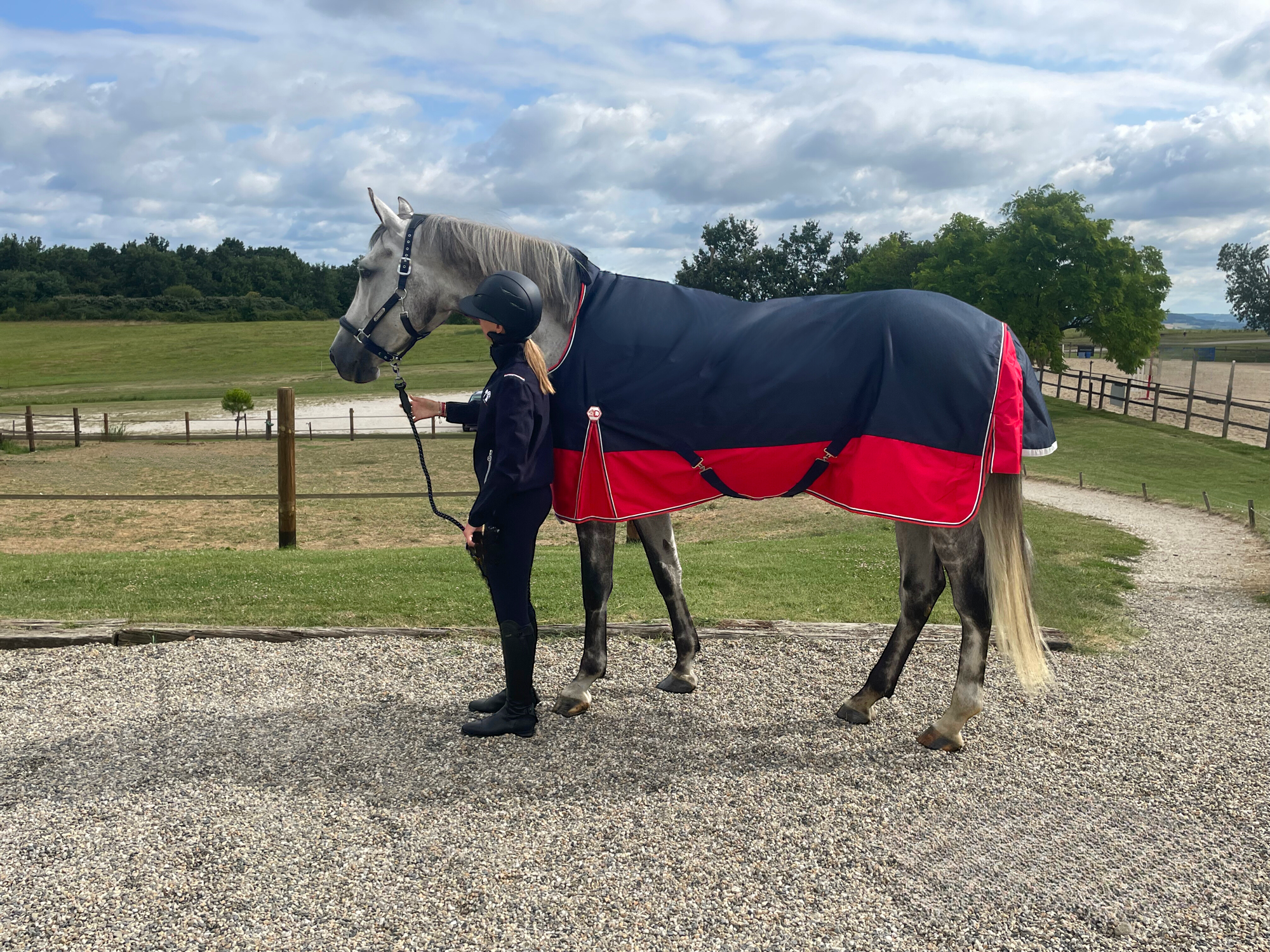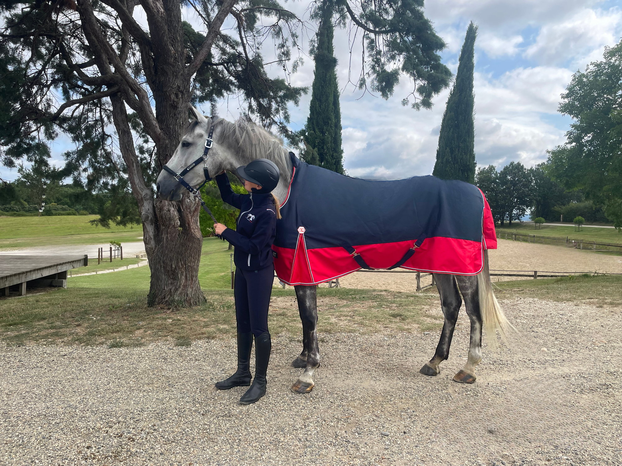 Couverture d’extérieur imperméable et respirante en polyester Ripstop 1200 deniers 3000/3000 avec coutures thermo-soudées, doublure nylon. Découpe d’encolure montante high neck. Equipée d’un très grand rabat de queue imperméable avec bande réfléchissante intégrée, de plis d’aisance, de sursangles croisées basses et de courroies de cuisses. Fermeture de poitrail par fixation rapide, renforcée par bandes auto-agrippantes, avec indication de la taille sur patch en caoutchouc.