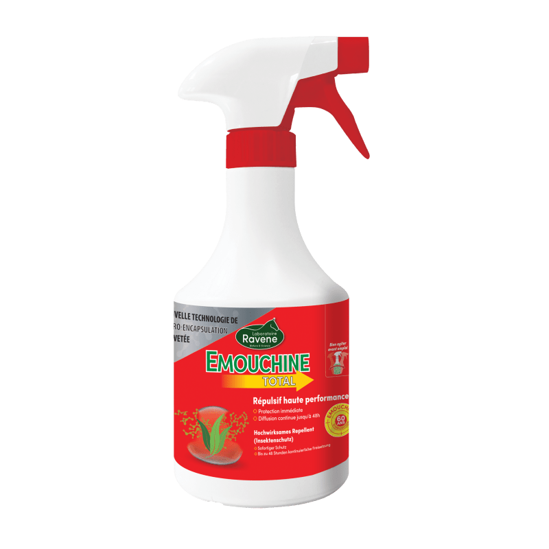 Emouchine Total est un répulsif haute performance à appliquer directement sur le poil de votre cheval. Efficace contre les mouches, moustiques, taons, mouches plates, culicoïdes, tiques…