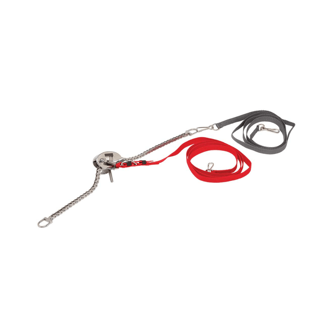 La poulie en acier inoxydable est vissée dans la selle (à la place du crochet McKinney), et l’avant du headcheck est attaché au dee à l’extrémité de la chaîne.