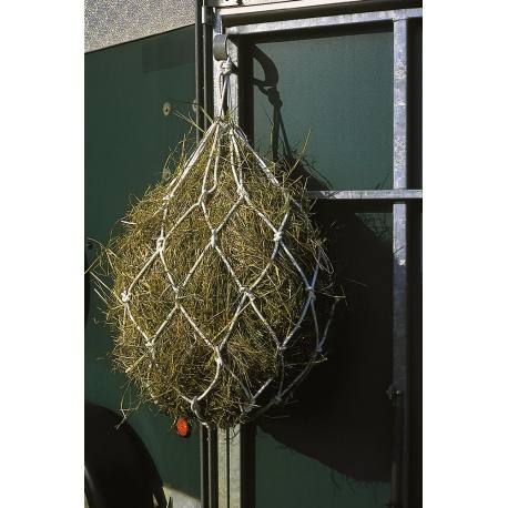 Filet à foin de grande contenance, avec anneaux nickelés.