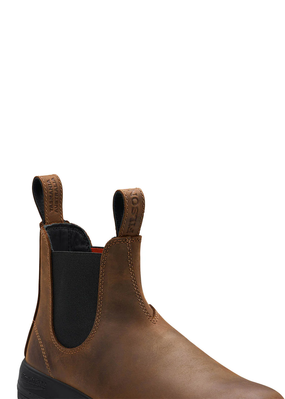 - Leather pull loops with Blundstone and Filson branding