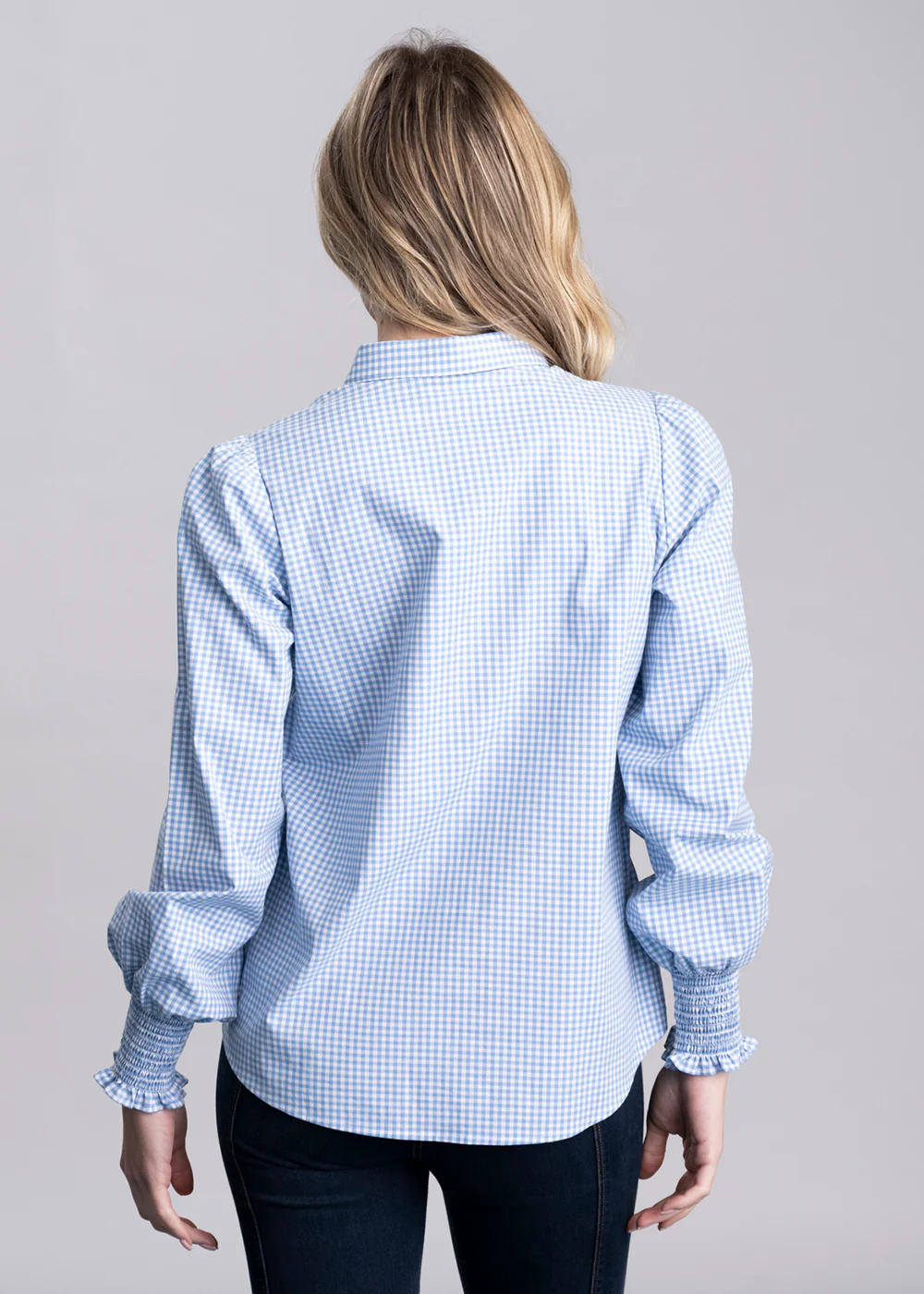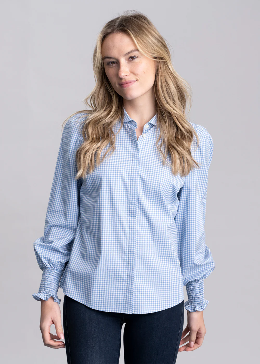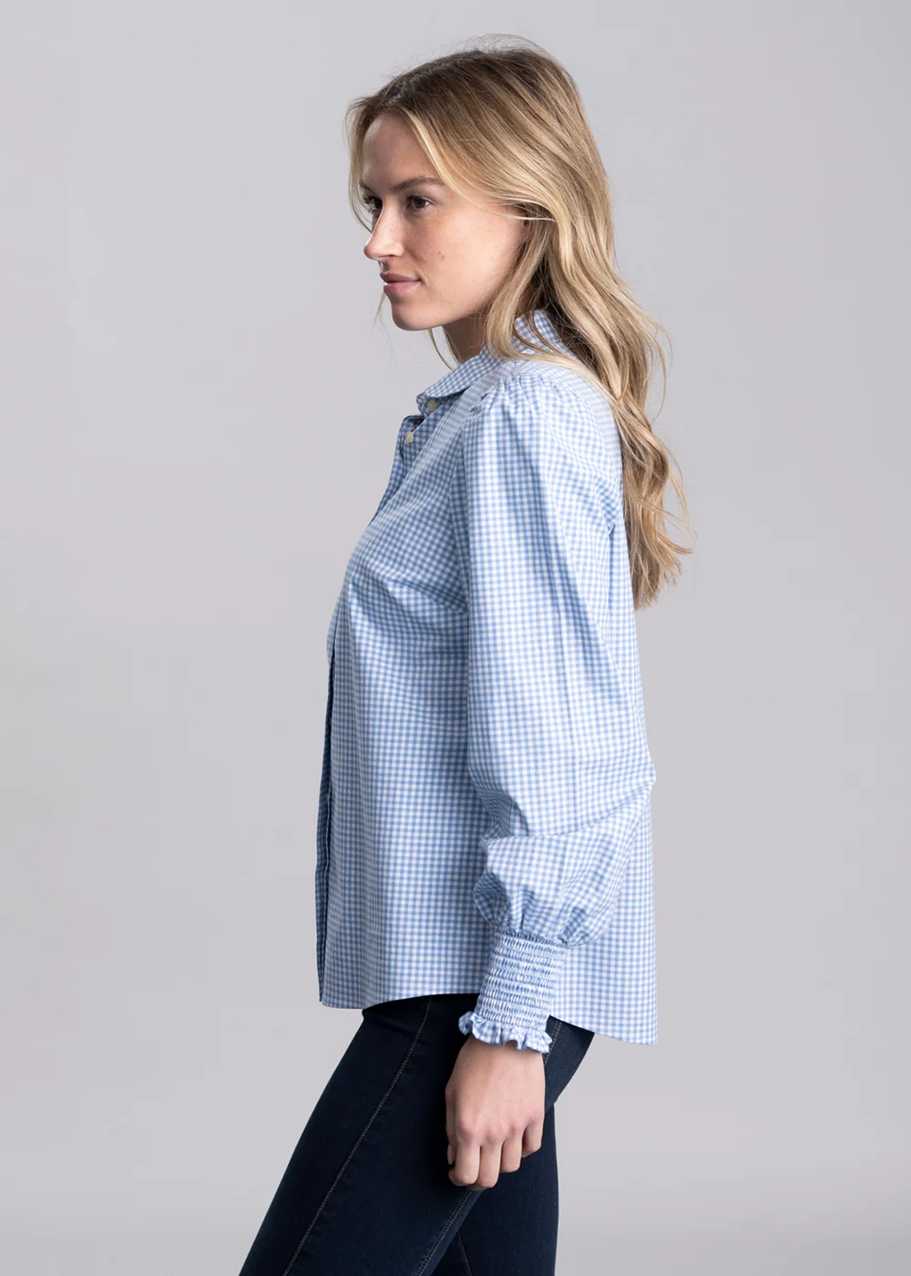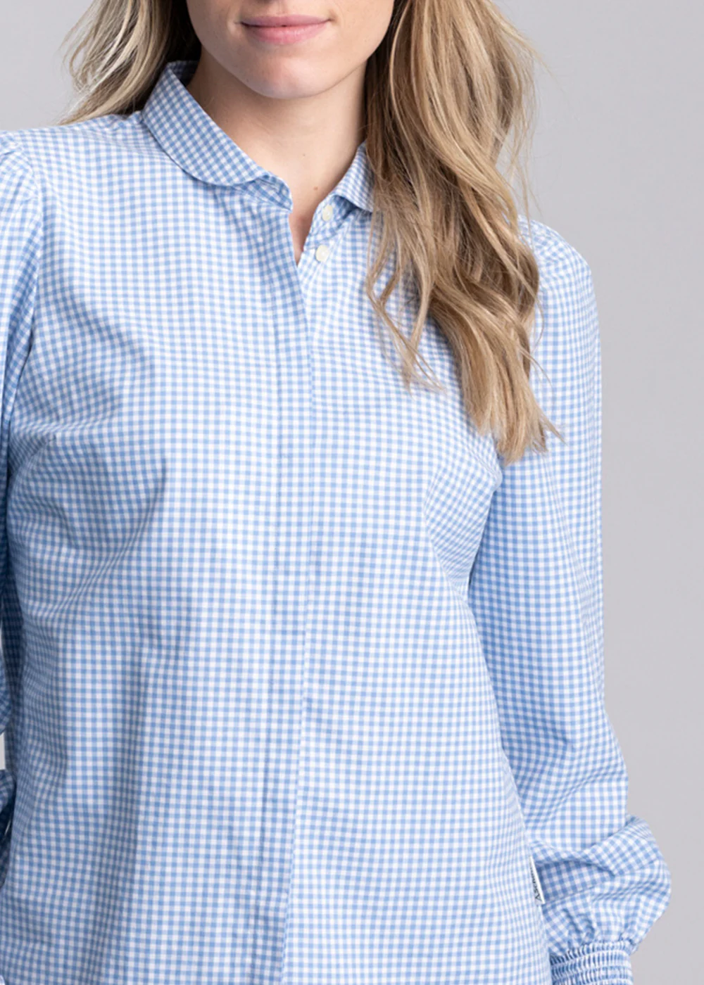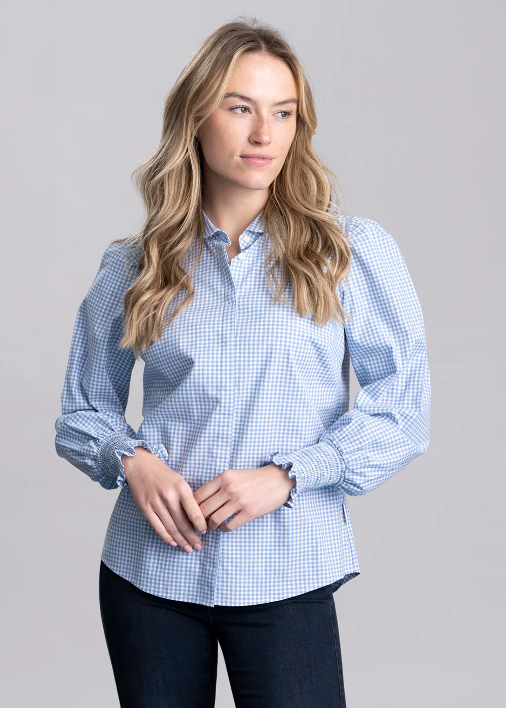 Key Features 97% cotton 3% elastane Slightly peached micro gingham stretch cotton Slim fit Fitted through body with looser fitting sleeves Smocked cuff with ruffle detail Schoffel branded buttons Peter pan collar Machine washable Fit GuidancePlease refer to our Size Guide for more detailed measurements. Code20-2055