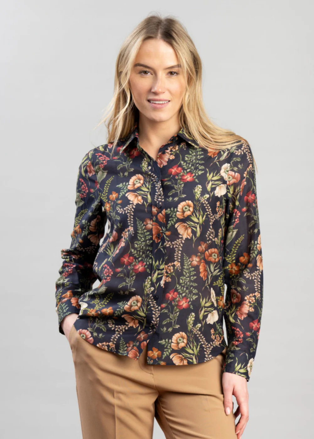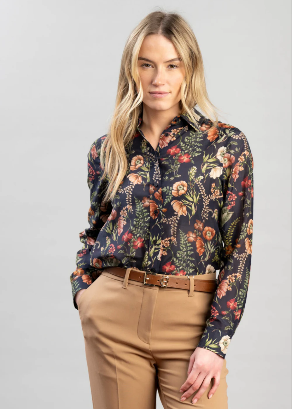 Key Features 70% Cotton, 30% Silk Regular fit Point collar Box pleat with locker loop at back Recycled polyester buttons Hand painted print design Fit GuidancePlease refer to our Size Guide for more detailed measurements. Product Care30°C mild fine wash, Do not bleach, Do not tumble dry, Iron at low temperature, Professional dry-cleaning. Code4300570