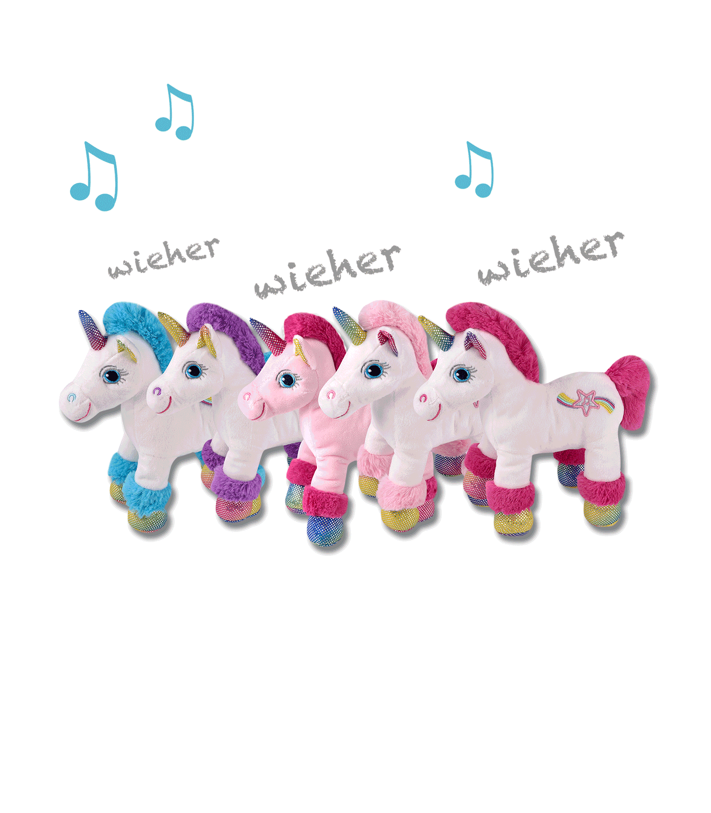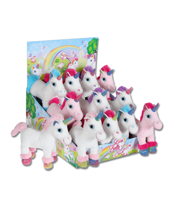 Peluche toute douce. Cet être magique est décoré d’un arc-en-ciel de la marque et présente des bracelets aux pattes de la même couleur que la crinière et la queue , sabots, oreilles et corne scintillants. De la musique retentit lorsque l’on appuie sur l’étoile. Pile incluse, non remplaçable. Différents coloris. À partir de 0 mois.