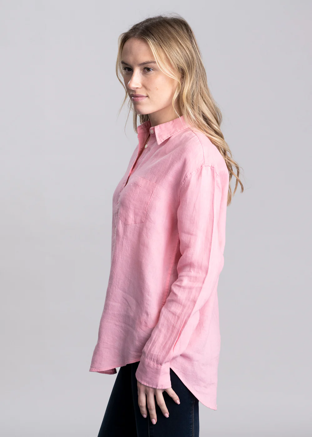 - Point collar and curved hem