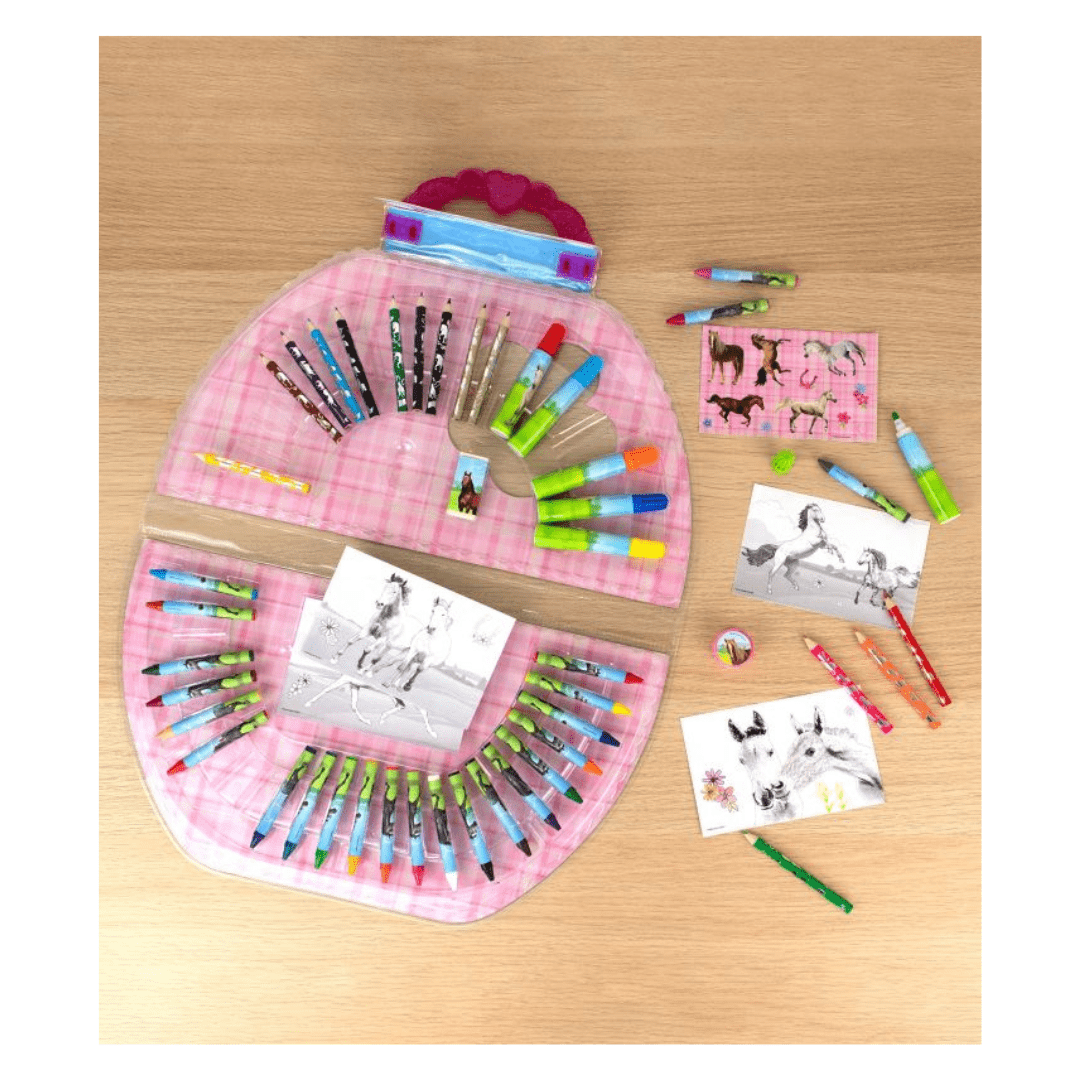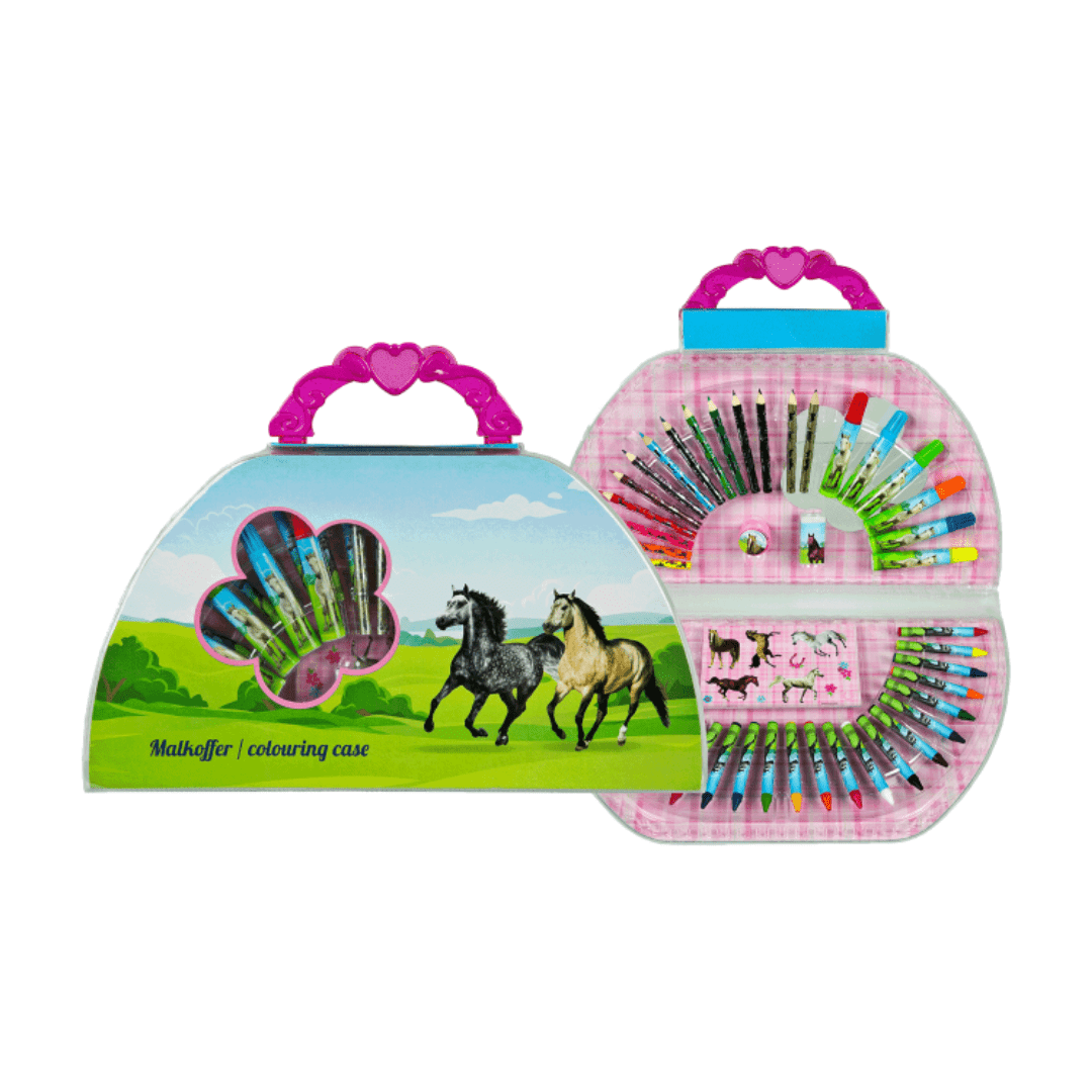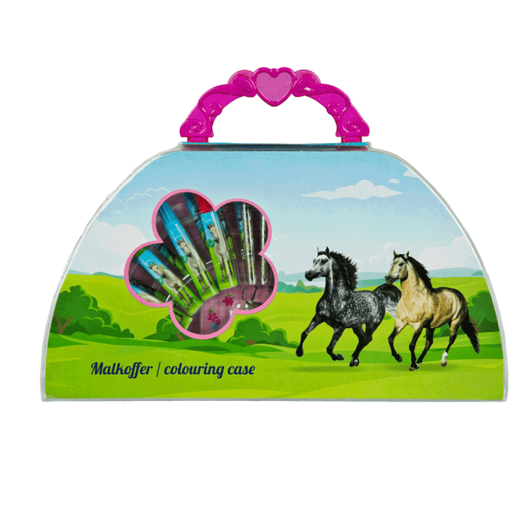 Des chevaux à perte de vue. La mallette de dessin semi-circulaire en plastique, avec poignée de transport rose, permet un rangement pratique.
