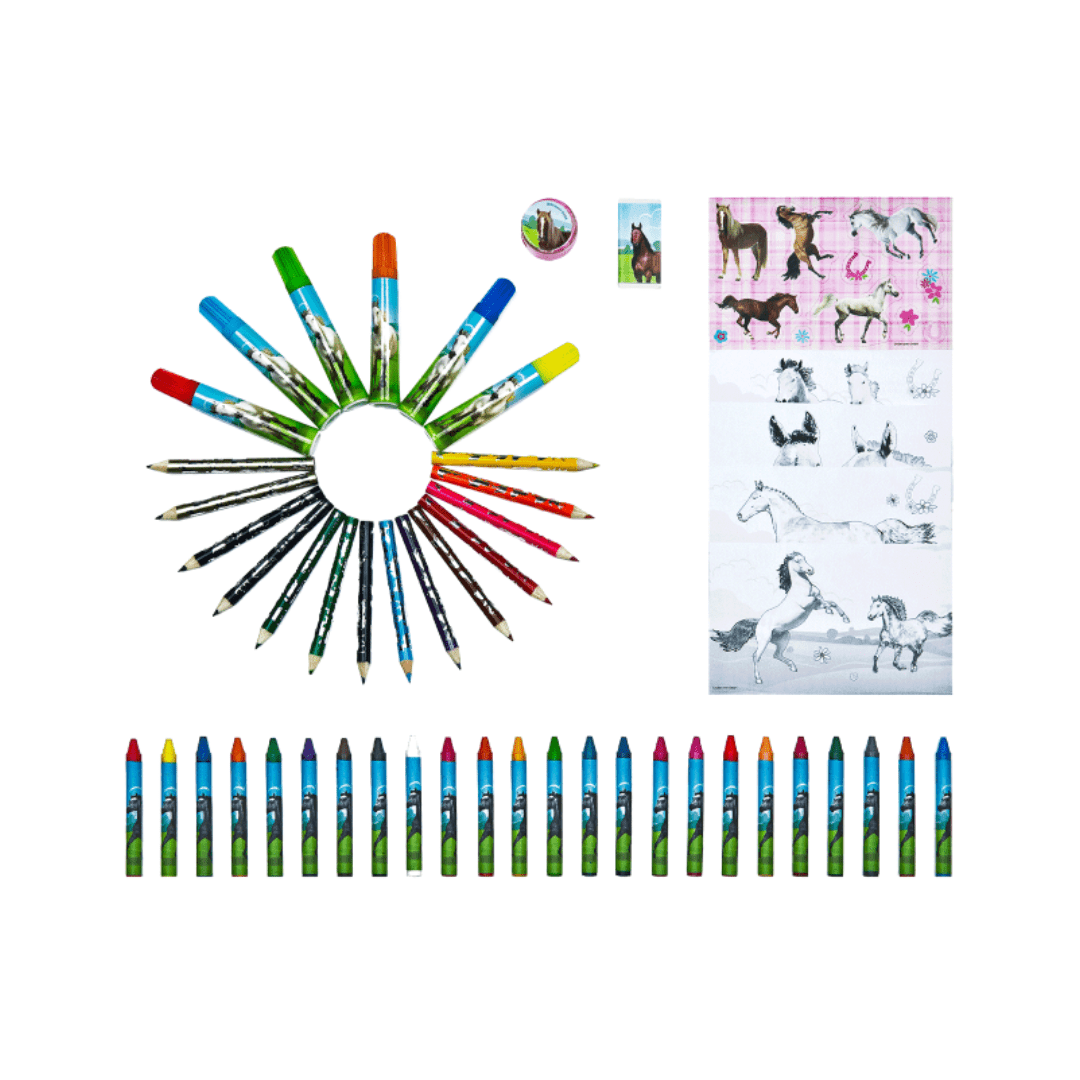 Contenu : 12 crayons de couleur, 6 feutres, 24 crayons de cire, 1 gomme, 1 taille-crayons, 2 crayons à papier, 4 modèles de coloriage et 1 feuille d’autocollants. Dès 3 ans.