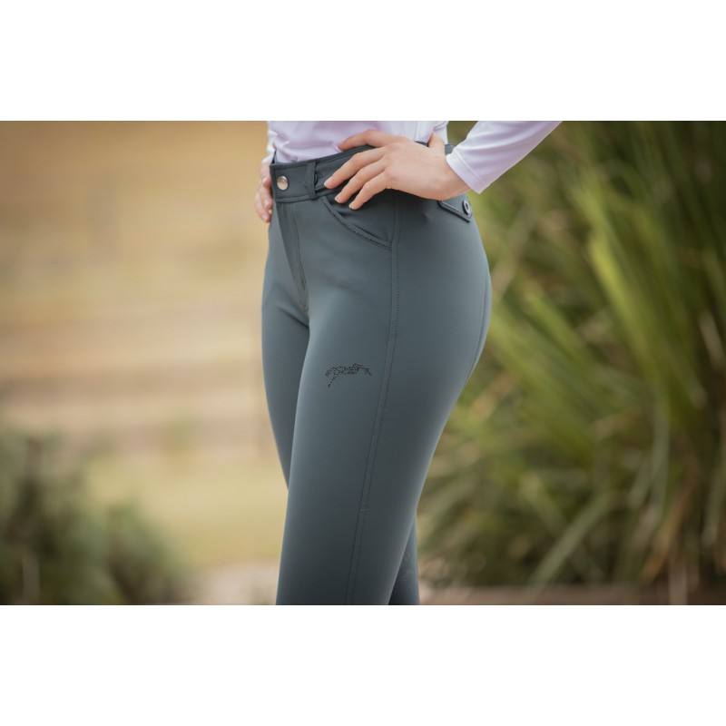 Pantalon d’équitation Élégance Pénélope doté d’un rang de strass sur la sur-ceinture mais également le long des deux poches avant et arrière. Un petit cheval Pénélope, également en strass, est posé au milieu de la jambe gauche. Ce pantalon d’un grand confort, grâce à son tissu stretch a des renforts anti-dérapants à l’intérieur des genoux et une taille légèrement haute, bien emboitante. Le bas de jambe est en lycra pour s’adapter à de nombreuses morphologies. C’est une très jolie pièce féminie et confortable à porter à l’entrainement, tous les jours, aux écuries.