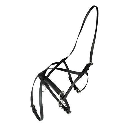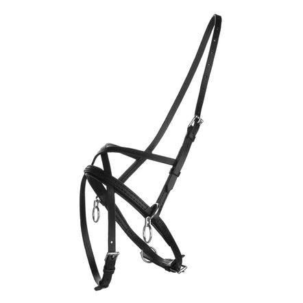 Petit licol avec muserolle non-amovible en forme de 8. Anneau double pour attache de la barre américaine, ainsi que l’anneau de martingale et une partie frontale ajustable par boucle.
