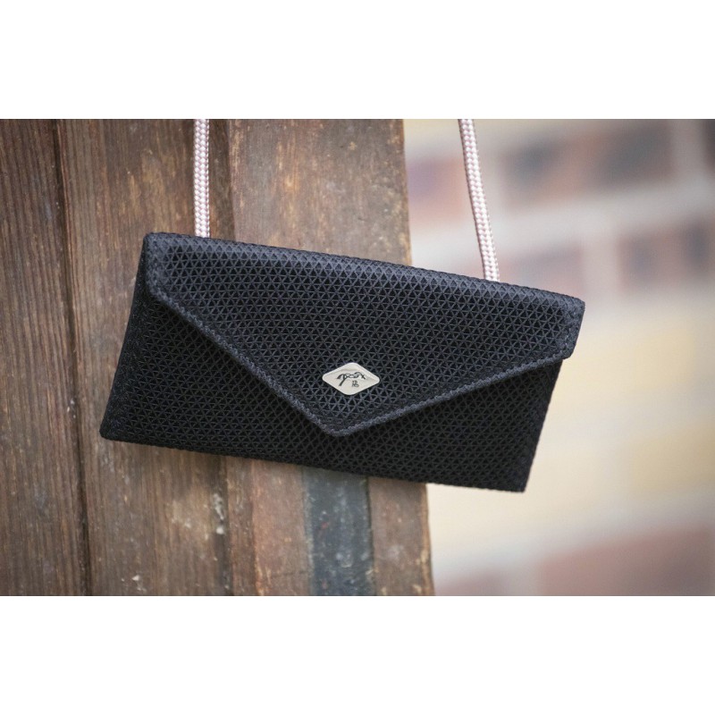 Pour sortir sans s’embarrasser du superflu, pour transporter votre téléphone portable partout sans qu’il vous gêne dans votre poche et parce que cette petite pochette est vraiment chouette, nous vous présentons la phone pocket Mesh Pénélope. Un support en Mesh noir esprit enveloppe assez craquant et un cordon réglable rose pâle pour s’adapter à toutes les tailles. Le logo Pénélope en argenté rehausse parfaitement le tout.