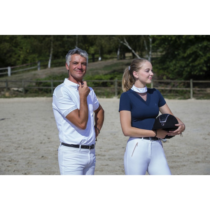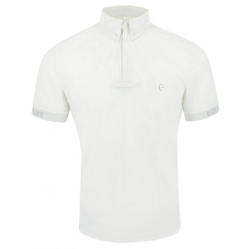 Polo de concours à col montant et à passant pour cravate. Ses empiècements en mesh sur les épaules optimisent l’évacuation de la transpiration.