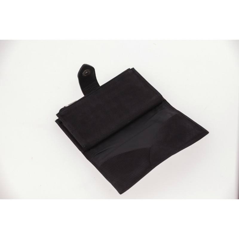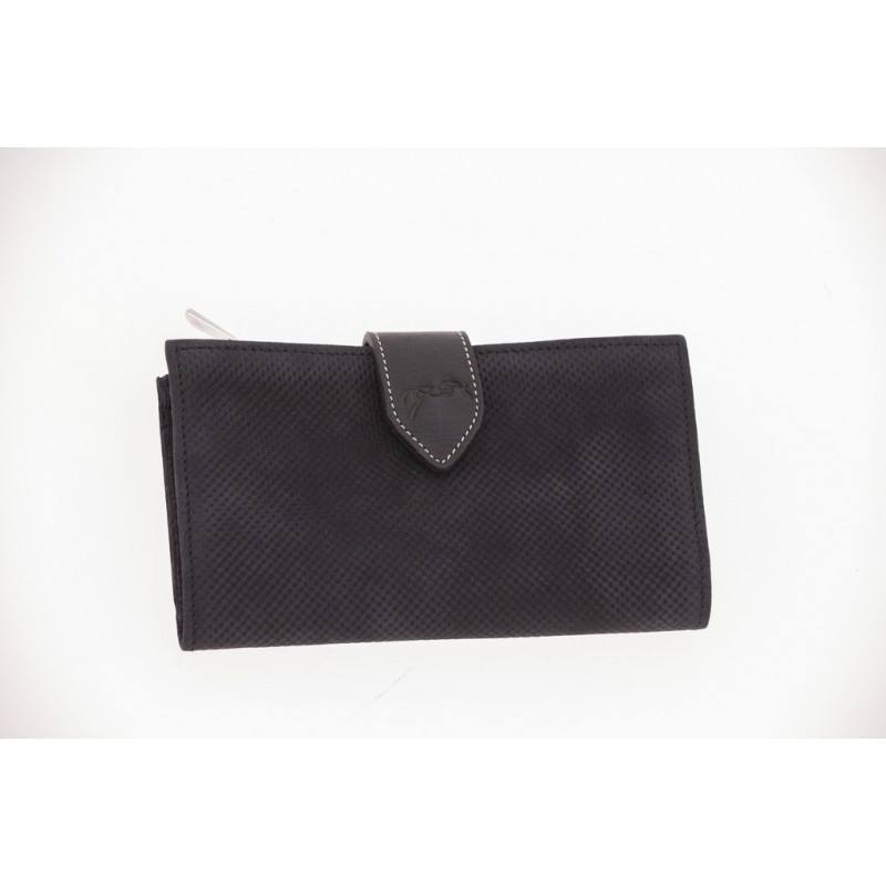 Portefeuille Pénélope en cuir micro-perforé noir, idéal pour emmener tous vos papiers et moyens de paiements avec vous. Il est composé de trois volets permettant de ranger votre monnaie, vos cartes bancaires ou autres cartes et votre carnet de chèque. Il se ferme grâce à une patte marquée du petit logo Pénélope