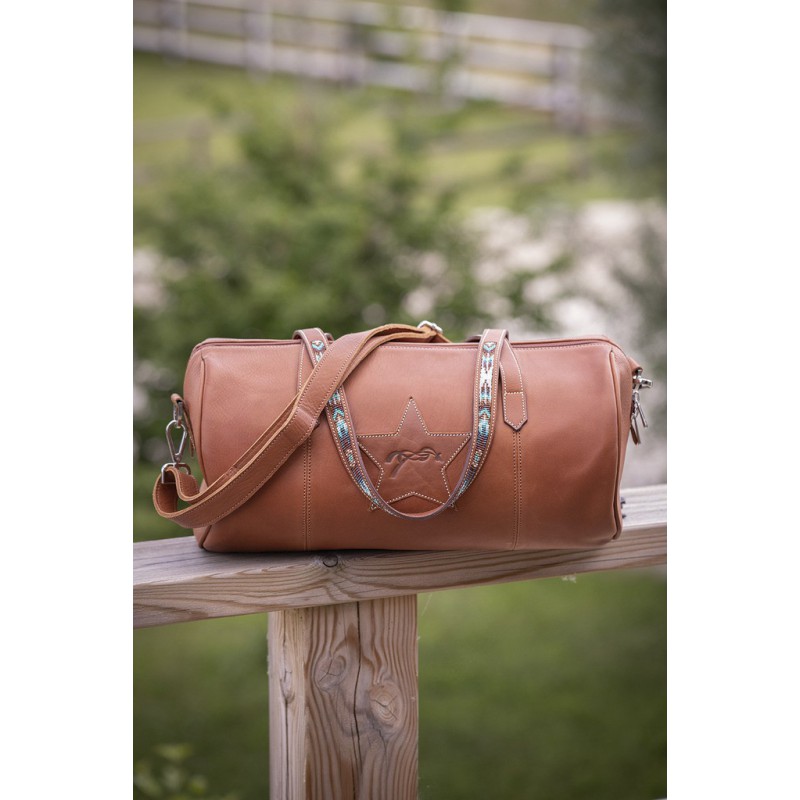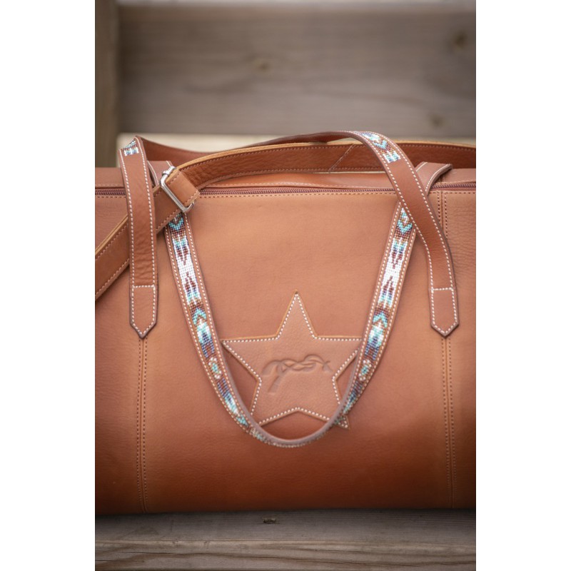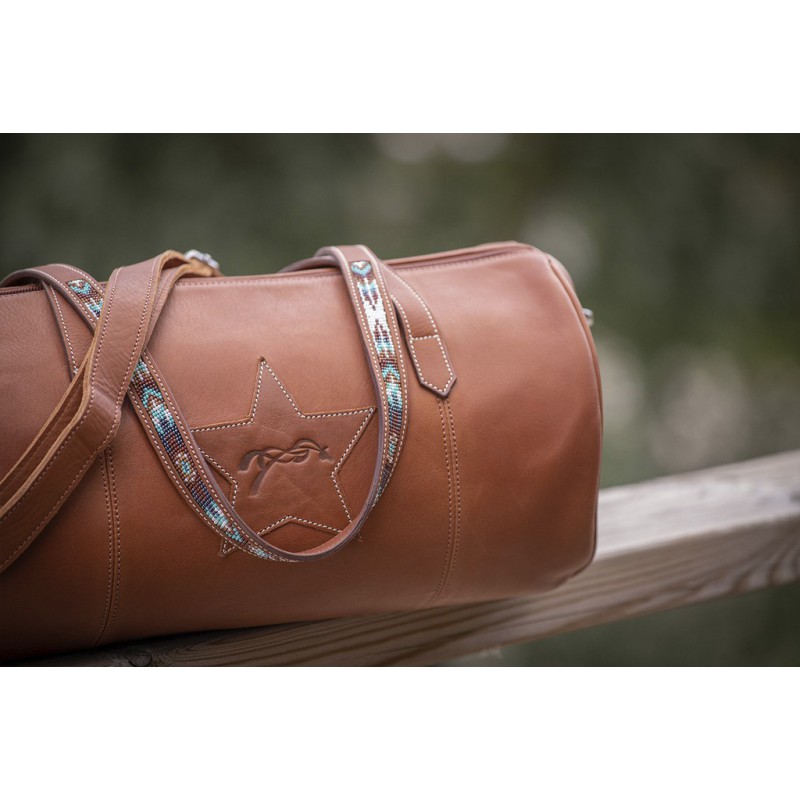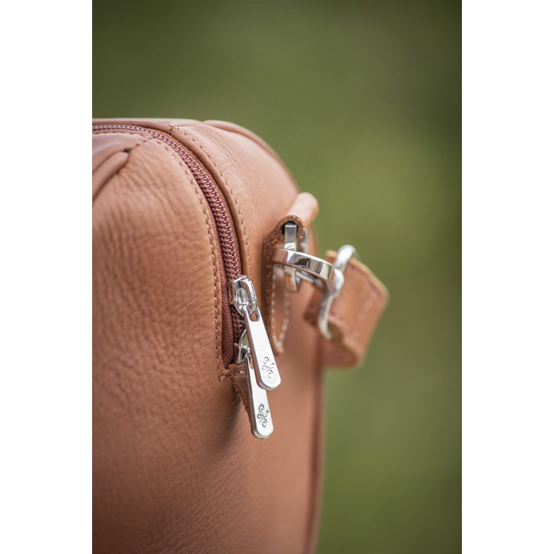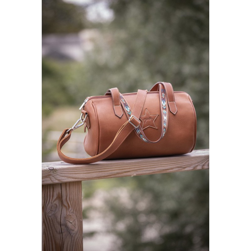 Sac à main ou petit bagage « Bowl » Pénélope forme bowling en cuir haut de gamme. Il est doté de deux anses rehaussées d’un rang de perles multicolores dans les tons turquoises pour le modèle cognac et avec le dessin du logo Pénélope sur le modèle noir. Au centre, on trouve un insert en cuir en forme d’étoile avec le logo Pénélope embossé. Il est également doté d’une bandoulière qui s’attache et se détache grâce à deux mousquetons argentés. Le sac se ferme grâce à un zip argenté sur le dessus. A l’intérieur, on trouve une doublure crème et une poche zippée.