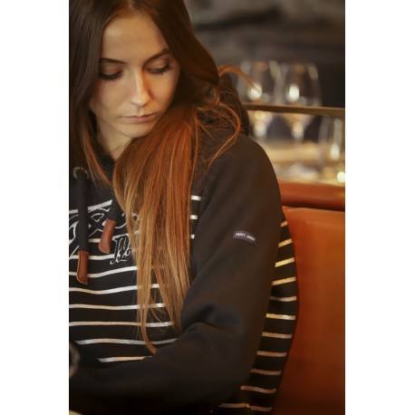 Il est doté d’une capuche et d’une poche centrale. Côté look, Sur fond bleu marine, il est composé de rayures argentée comme une marinière et le logo Pénélope apparait en grand en bouclette pailleté sur le devant. Sur le bras gauche, le logo Saint James est visible sur une petite étiquette en tissu marine.