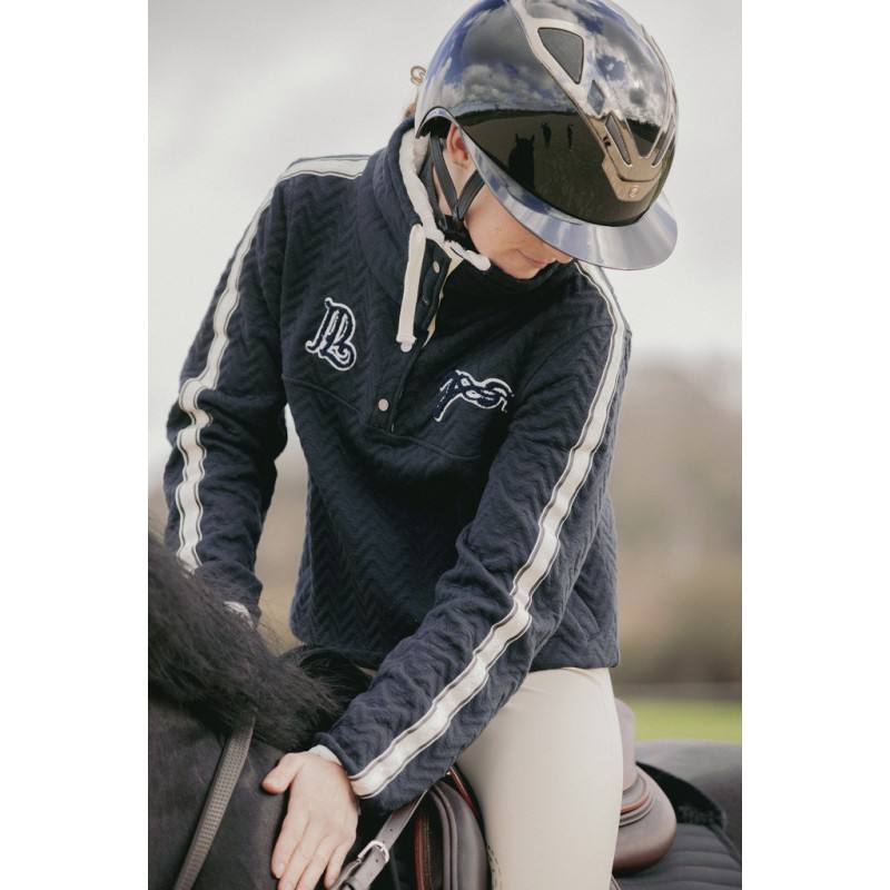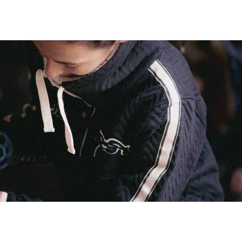 Sweat-shirt « Sheepita » marine qui s’enfile par la tête et matelassé en chevrons. Il est doté d’un col haut doublé de polaire off-white ultra-douce et qui se ferme par quatre petites pressions argentées logotées Pénélope. Un cordon off-white permet un resserrage facile. Sur le devant, de part et d’autres de la boutonnière, il y a deux jolies broderies Pénélope (le monogramme PL et le petit cheval de la marque) en bouclette marine sur fond blanc. Le long des bras, un galon plat, large et dans les tons argentés, off white et gris est cousu des épaules jusqu’aux poignets. En bas, un galon élastique plat blanc en contraste permet un ajustement confortable sur les hanches. Le sweat Sheepita a également deux poches ouvertes de chaque côté. Il se porte aisément aussi bien en ville qu’aux écuries.
