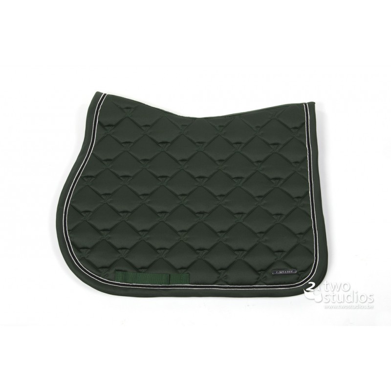 Tapis de selle « Venus ». Aspect satin à l’extérieur, mousse haute densité 5 mm, garniture synthermax 240 g et doublure Quick-Dry. Galon noir/blanc.