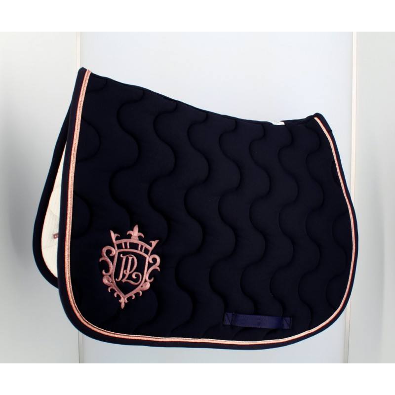 Un nouveau modèle vient agrandir la gamme des tapis de selle des Collections Pénélope Leprévost. Le tapis de selle change son iconique Point Sellier pour le passepoil Rose Gold. Avec son fil lurex pailleté, il égaillera vos ensembles et s’assortira facilement à toutes les robes. Le blason et le sauteur PL sont assortis.
