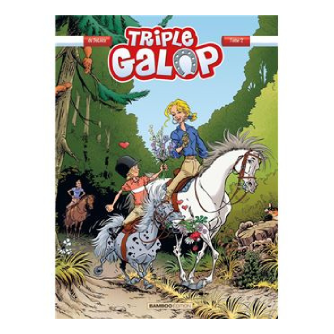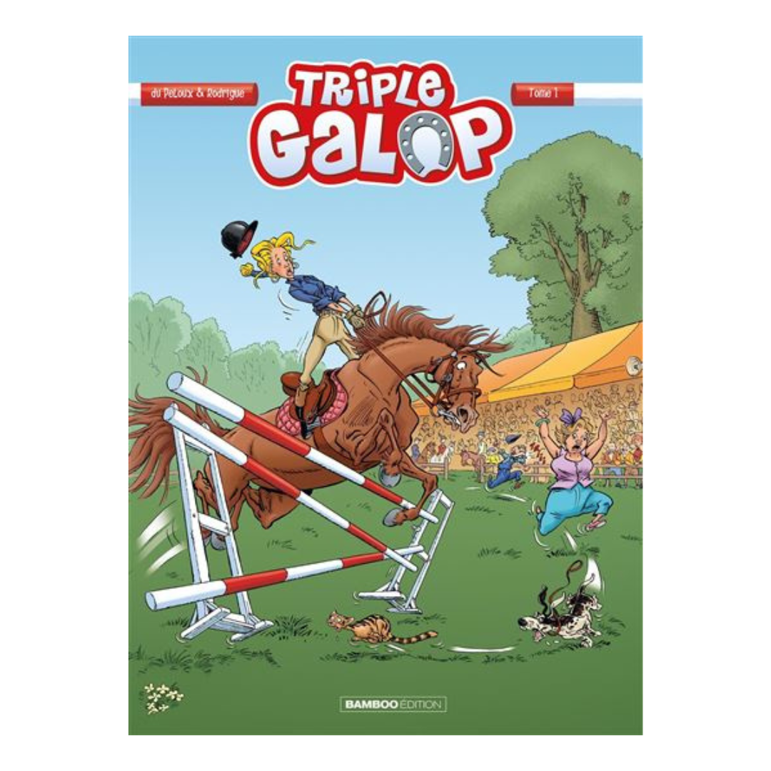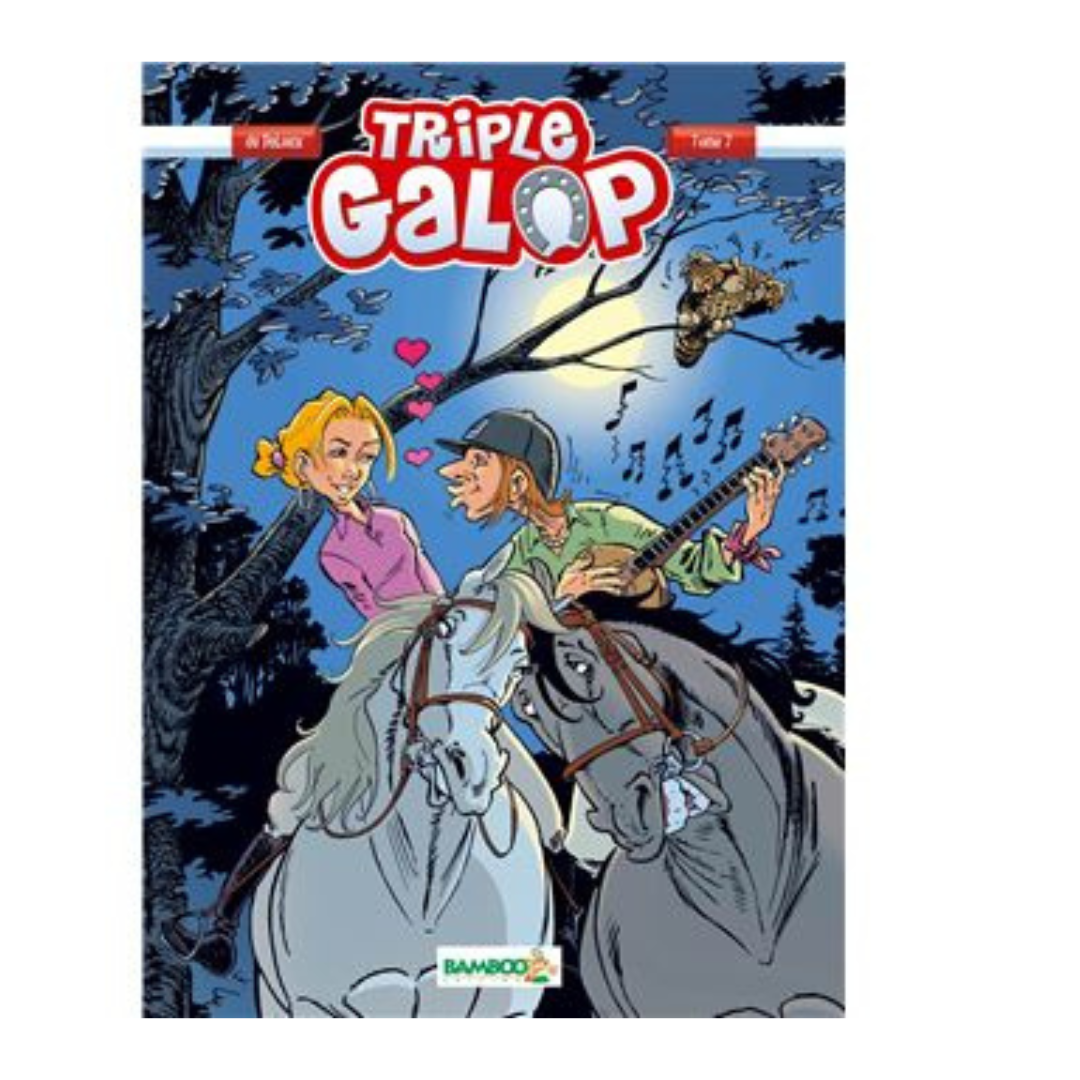 Séances de mise en forme, toilettage, promenades dans les bois… Eh oui, la plus belle conquête du cheval, c’est bien l’homme ! Ce ne sont pas les personnages hauts en couleur de cette BD qui le démentiront. Souvenez-vous, vous les avez sûrement déjà croisés… Il y a Monique, la monitrice du club hippique, pas très féminine, râleuse mais sympa ; son frimeur de fils Roméo, qui rêve d’être un grand champion de concours hippique ; Bébert, l’emblématique palefrenier qui a toujours vécu «dans» les chevaux… Des chevaux fièrement représentés par Mascotte, le poney facétieux, Blanche Neige la jolie jument ou Ramsès le crack. Amoureux des chevaux, pas d’hésitation ! Tous en selle pour « Triple Galop », la seule et unique BD très à cheval sur l’humour !