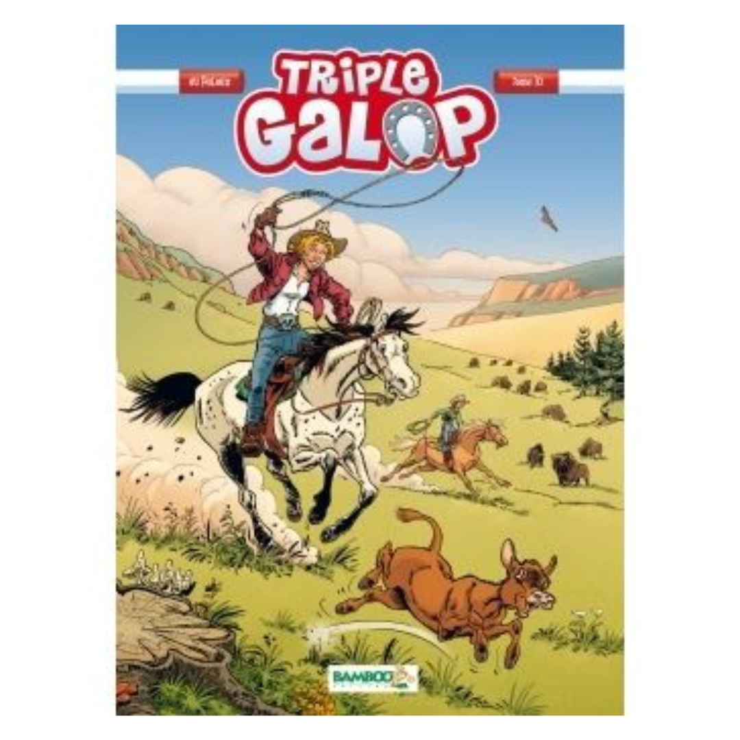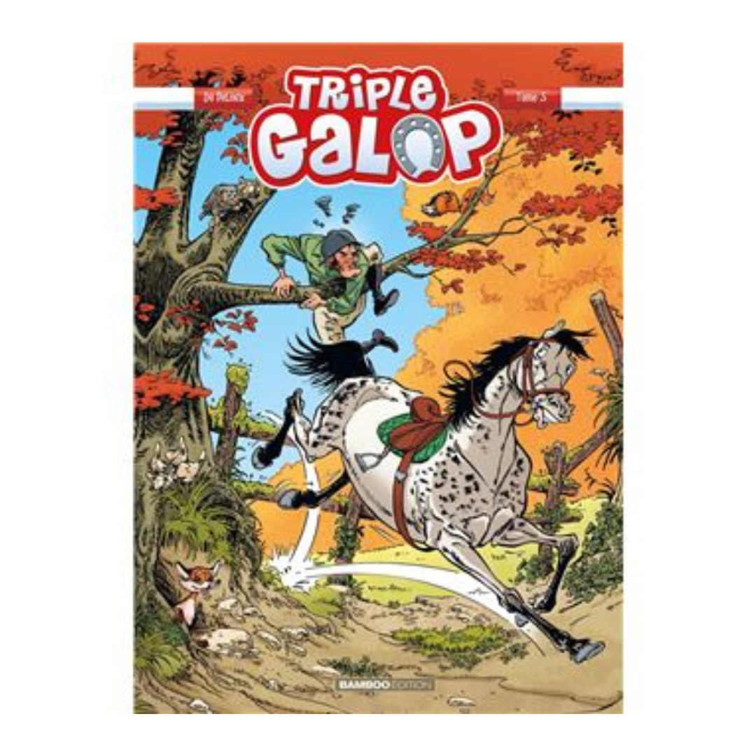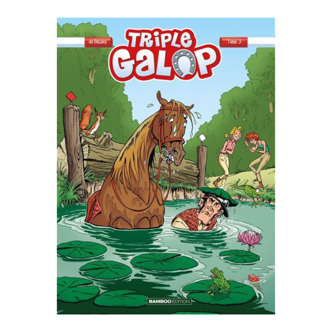 Séances de mise en forme, toilettage, promenades dans les bois… Eh oui, la plus belle conquête du cheval, c’est bien l’homme ! Ce ne sont pas les personnages hauts en couleur de cette BD qui le démentiront. Souvenez-vous, vous les avez sûrement déjà croisés… Il y a Monique, la monitrice du club hippique, pas très féminine, râleuse mais sympa ; son frimeur de fils Roméo, qui rêve d’être un grand champion de concours hippique ; Bébert, l’emblématique palefrenier qui a toujours vécu «dans» les chevaux… Des chevaux fièrement représentés par Mascotte, le poney facétieux, Blanche Neige la jolie jument ou Ramsès le crack. Amoureux des chevaux, pas d’hésitation ! Tous en selle pour « Triple Galop », la seule et unique BD très à cheval sur l’humour !