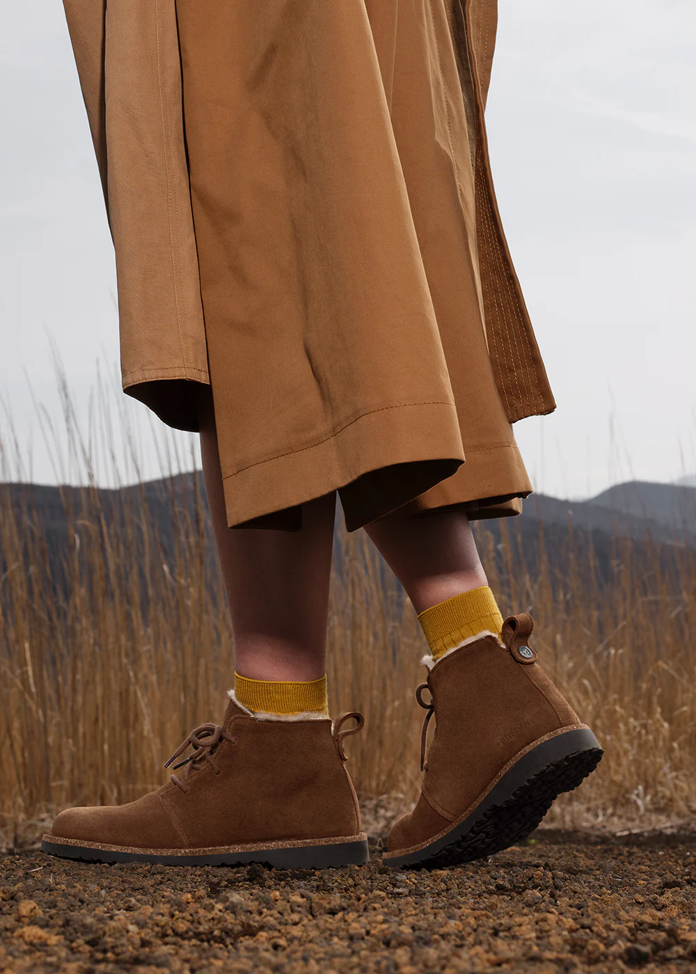 Key Features 100% Suede with a shearling lining Natural leather footbed Lace up ankle boot Removable anatomically shaped cork-latex-footbed Light sole made from synthetic materials Footbed Made in Germany Lace up ankle boot Sizing AvailabilityUK 4.5 (EU 37) – UK 7.5 (EU 41) Code1028086